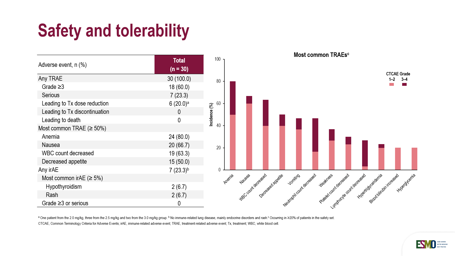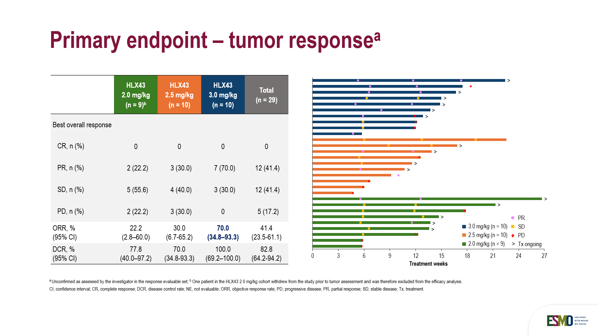 在29例可评估疗效的患者中,研究者评估的客观缓解率(ORR)为41.4%,疾病控制率(DCR)为82.8%。其中,3 mg/kg剂量组的ORR和DCR为70.0%和100%,患者中位PFS尚未达到。